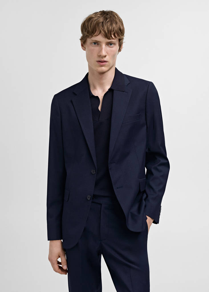 修身版型. 舒适弹力:弹力面料,更显舒适. 凹形翻领和袖窿. 前面双扣闭合. 胸前嵌线口袋. 两个正面翻盖口袋. 背后开两道叉. 内衬. 三个内袋. 精裁西装系列. 舒适拉伸:水平和垂直拉伸面料,增加舒适度. 系扣长袖