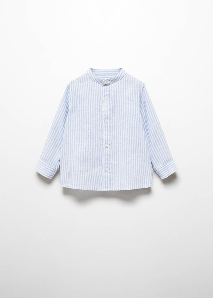 Colección fiesta, ceremonia y comunión. Tejido de lino. Estampado de rayas. Diseño recto. Cuello mao. Manga larga. Puños abotonados. Cierre de botones