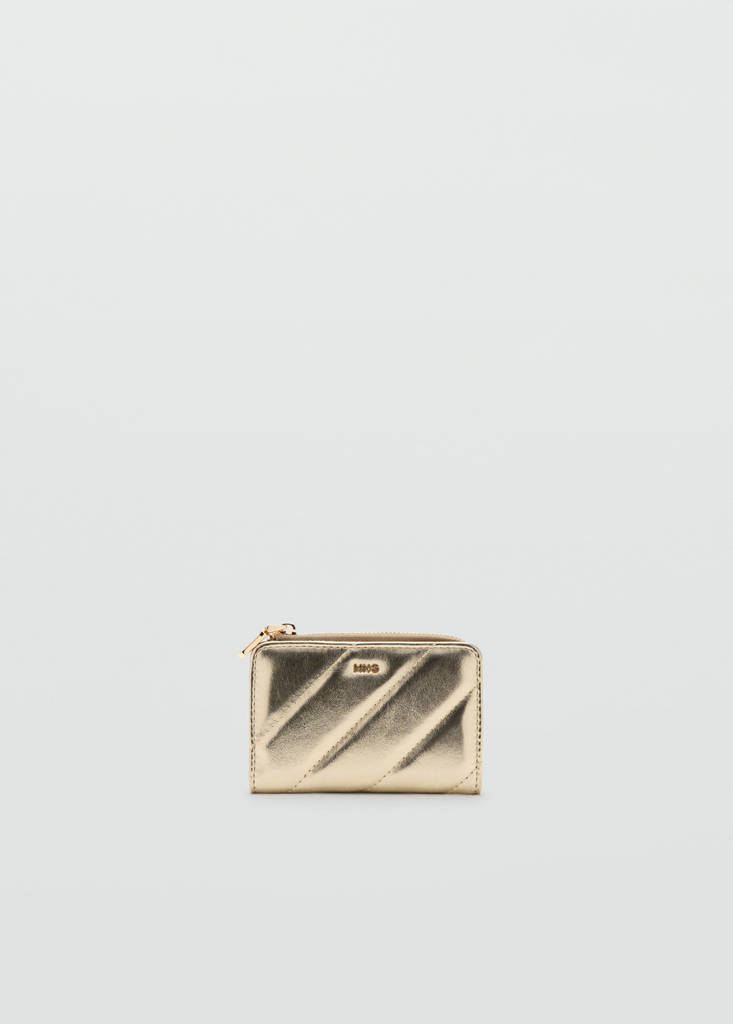 Tamaño pequeño. Diseño acolchado. Diseño metálico. Seis ranuras para tarjetas. Bolsillo de cremallera. Cierre de solapa con botón a presión