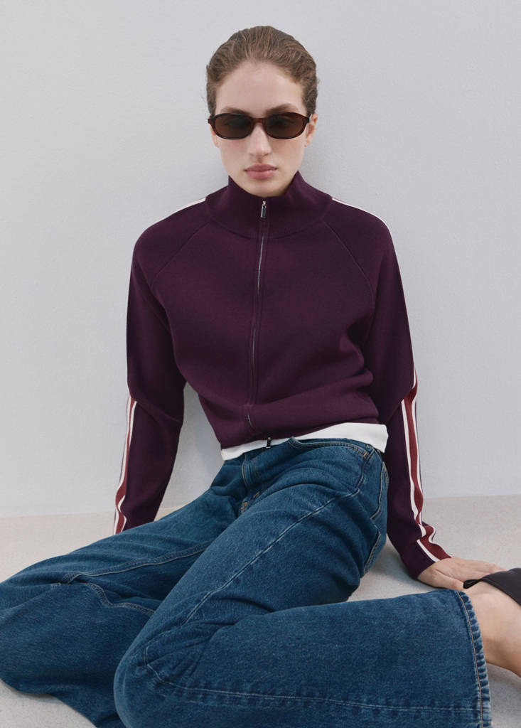 Tejido de punto. Diseño recto. Estampado de rayas combinadas. Cuello perkins. Manga larga. Cierre delantero con cremallera. Total look