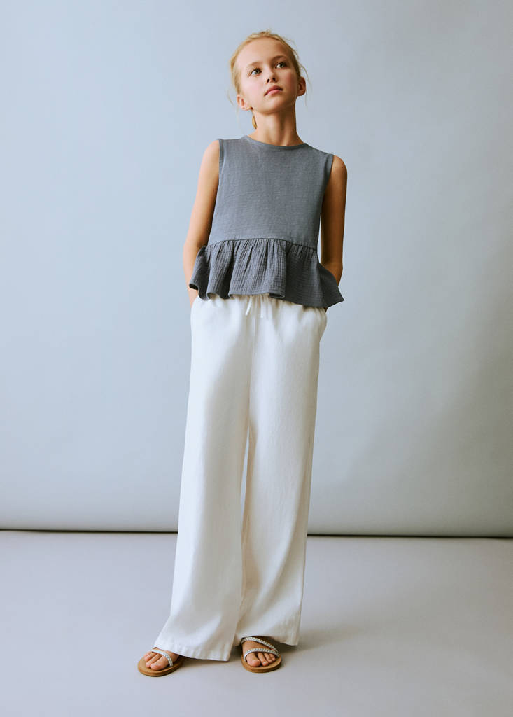 Tejido 100% algodón. Diseño liso. Cuello redondo. Sin mangas. Espalda abierta con cierre de lazo. Acabado con volante parte inferior. Acabado de bambula