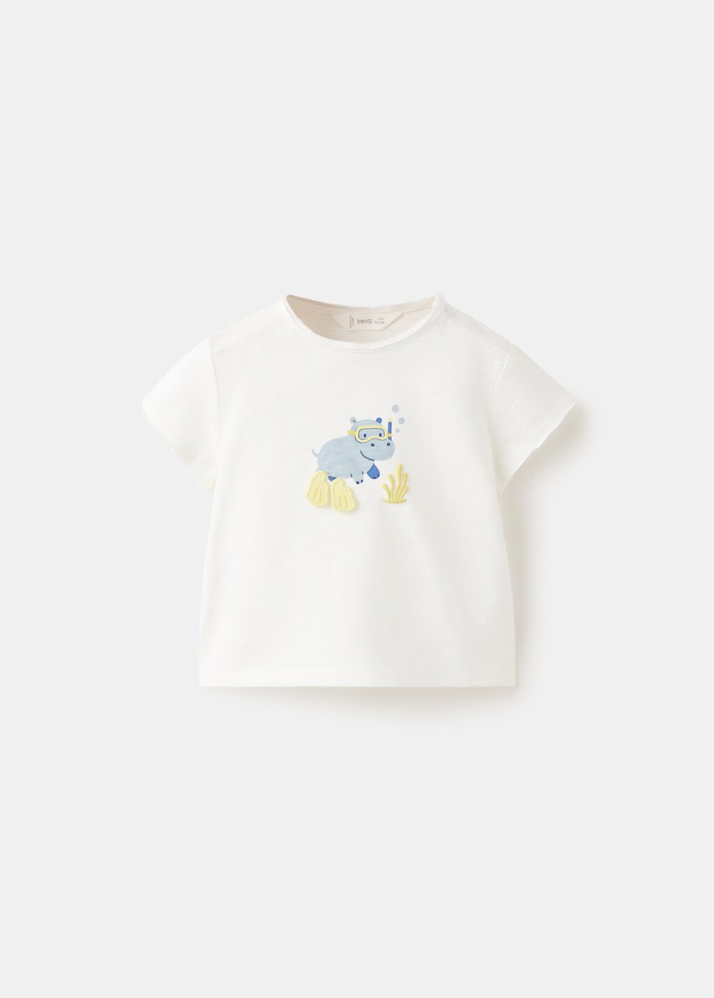 Tejido 100% algodón. Diseño recto. Cuello redondo. Manga corta. Dibujo estampado en el pecho.