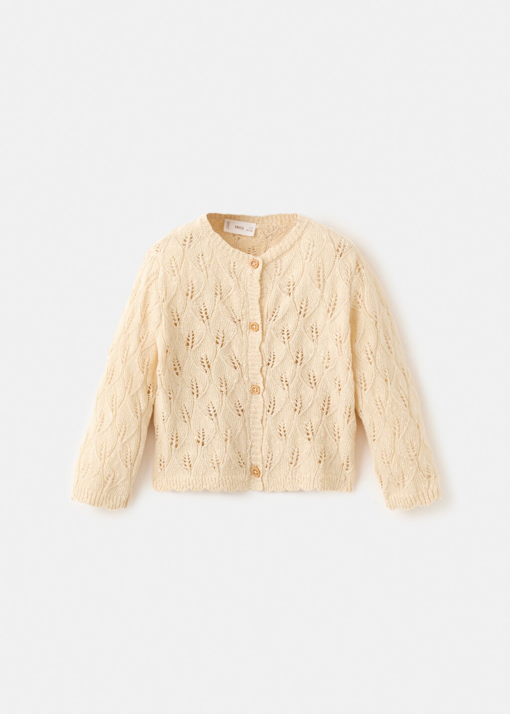 Tejido 100% algodón. Tejido de punto calado. Diseño recto. Cuello redondo. Manga larga. Cierre de botones en la parte delantera. Total look.