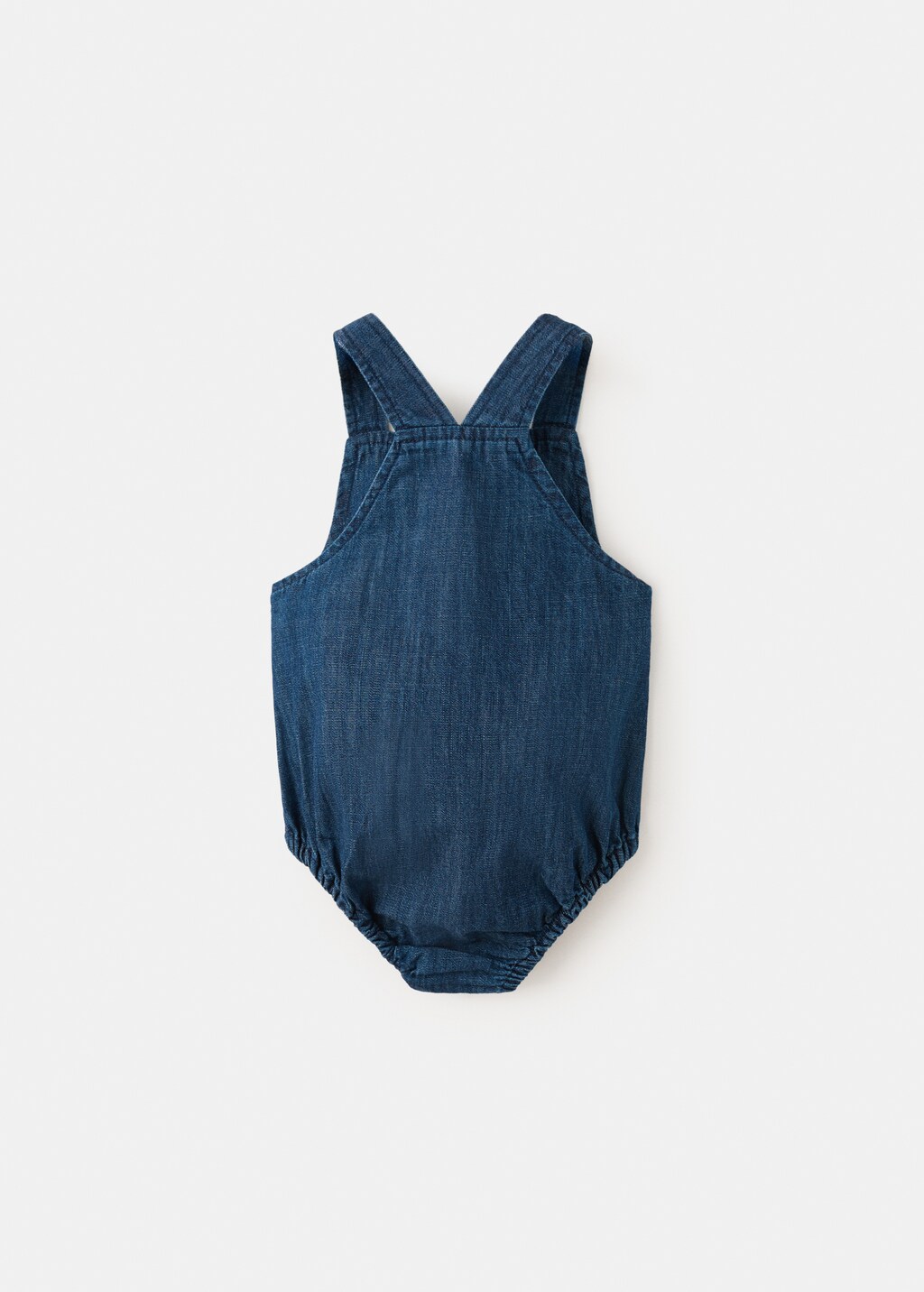 Tejido de algodón estilo tejano vaquero. Diseño recto. Diseño corto. Cuello recto. Tirantes cruzados. Cierre delantero con botones. Abertura en el bajo con cierre de botones.
