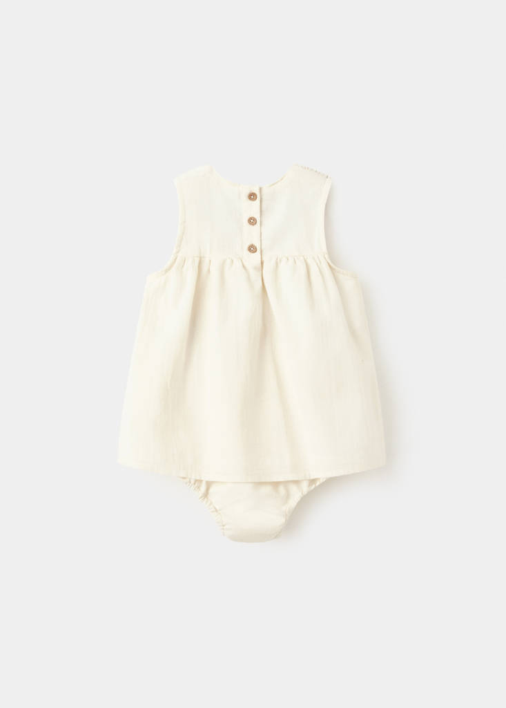 Tejido 100% algodón. Cuello redondo. Tirantes. Ranita terminaciones elásticas. Cierre de botones en la parte posterior. Detalle de crochet en el cuello