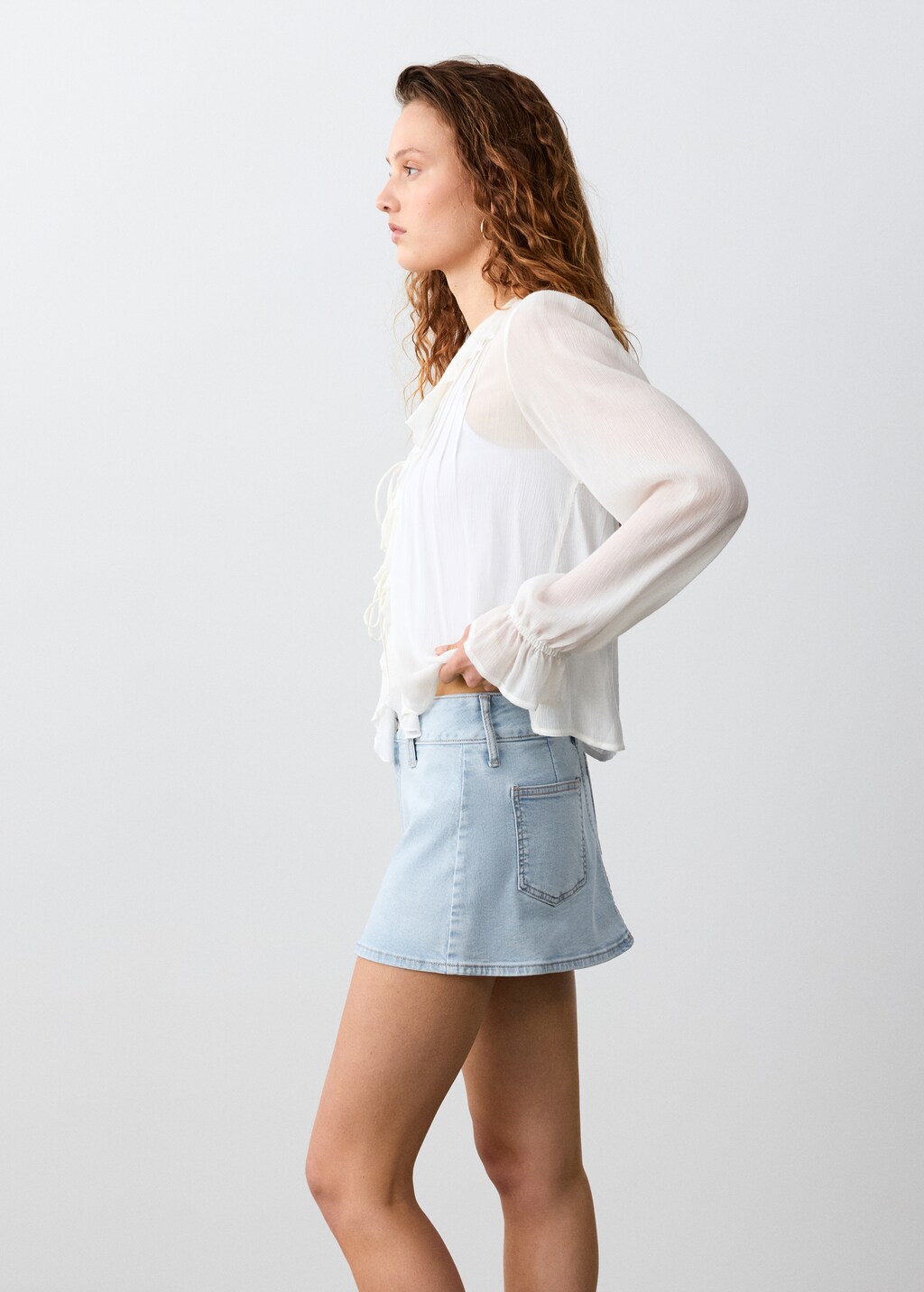 Tejido de algodón estilo tejano vaquero. Diseño recto. Diseño corto. Trabillas para cinturón. Diseño doble botonadura. Cierre de cremallera y botón.