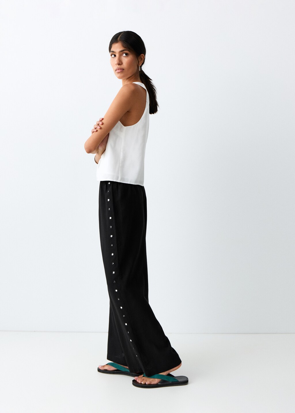 Tejido mezcla de lino. Diseño recto. Diseño largo. Cintura elástica. Dos bolsillos laterales. Detalle de tachuelas.