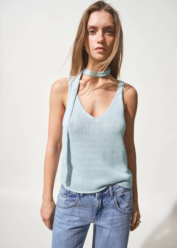 Tejido de punto fino. Diseño recto. Escote de pico. Adorno de fular en el cuello