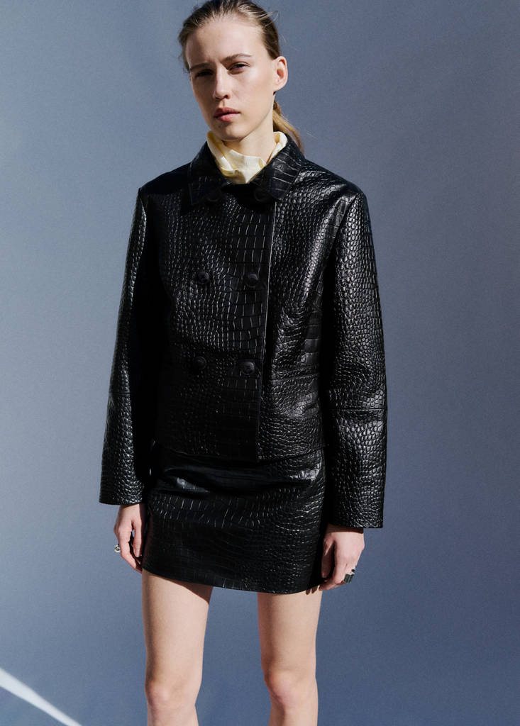 100% piel ovino. Efecto cocodrilo. Diseño corto. Diseño entallado. Tiro bajo. Cierre de cremallera en la parte posterior. Total look. Combina esta falda con un abrigo de efecto cocodrilo a conjunto para formar un 'total look' de piel. Exclusivo Online. Colección Selection