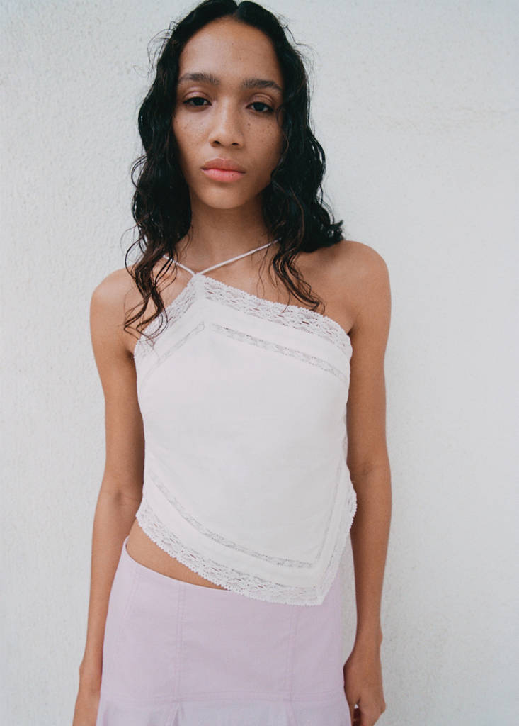 Tejido mezcla de lino. Diseño asimétrico. Tirantes finos. Detalles encaje. Cierre de botones laterales. Esta prenda pertenece a nuestra colección de fiesta y evento, diseñada para elevar tus looks en ocasiones especiales