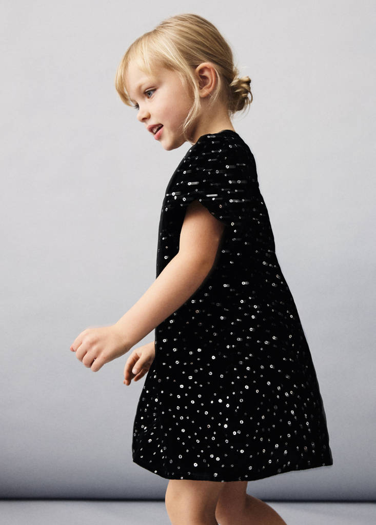 Velvet fabric. A-line design. Sequin detail. Round neck with button closure. Short sleeves. Party and events collection. Christmas Collection