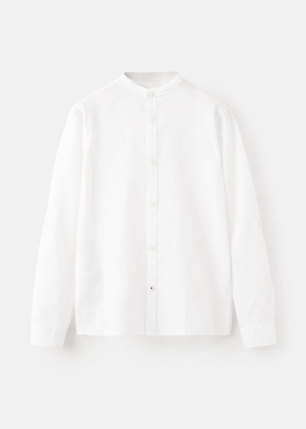 Cotton and linen blend fabric. Straight design. Shirt collar. Long sleeves with buttoned cuffs. Front closure with buttons.