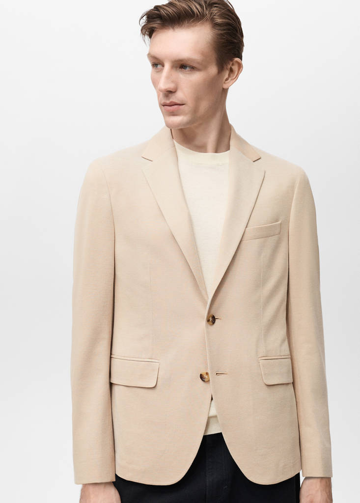 Tailoring collection. Slim fit. Cotton blend fabric. Lapel with notch. Button up. Chest welt pocket. Two welt and flap pockets on the front. Buttoned strap cuffs. Two openings at the back of the hem. Inside welt pocket
