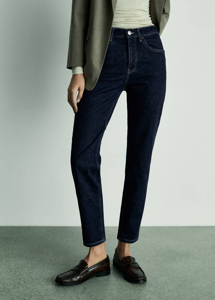 Denim-style cotton fabric. Stretch fabric. Mom-fit. High waist. Rinse wash. Belt loops. Five pockets. Zip and button fastening. Available Plus. Inseam 70 cm