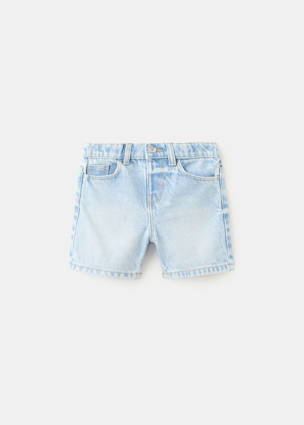 Denim-style cotton fabric. Straight design. Short design. Elasticated waistband. Belt loops. Five pockets. Zip and button fastening.