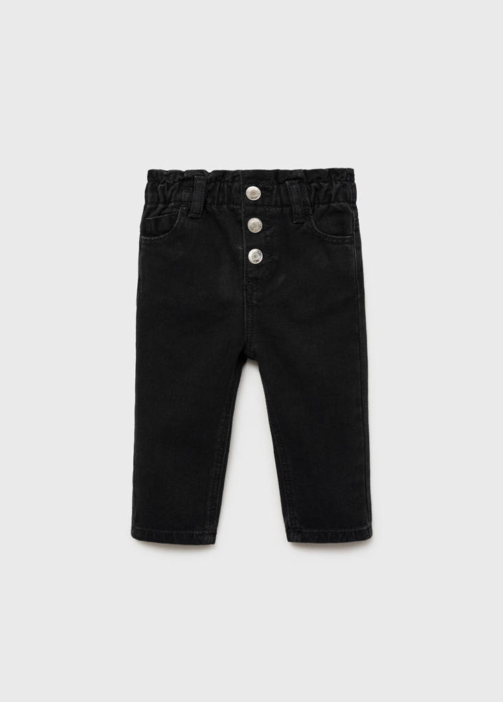 Paper bag jeans with buttonsCurrent price [€ 19.99 ]€ 19.99Select a colourBlack denimSelect your size9-12 months (80cm)Not available. I want it!12-18 months (86cm)Not available. I want it!18-24 months (92cm)Not available. I want it!2-3 years (98cm)Not available. I want it!3-4 years (104cm)Not available. I want it!4-5 years (110cm)Not available. I want it!5-6 years (116cm)Not available. I want it!DimensionsNotify meAdd to WishlistSee lookFree delivery to store100% cotton fabric. Long design. Elastic paperbag waistband. Belt loops. Button up. Two side pockets. Two patch pockets at the backDetails, composition and careStore availabilityItem qualitiesRecycled cottonAt least 20%This fibre is obtained from pre- and post-consumer textile waste that is transformed into new fabrics.