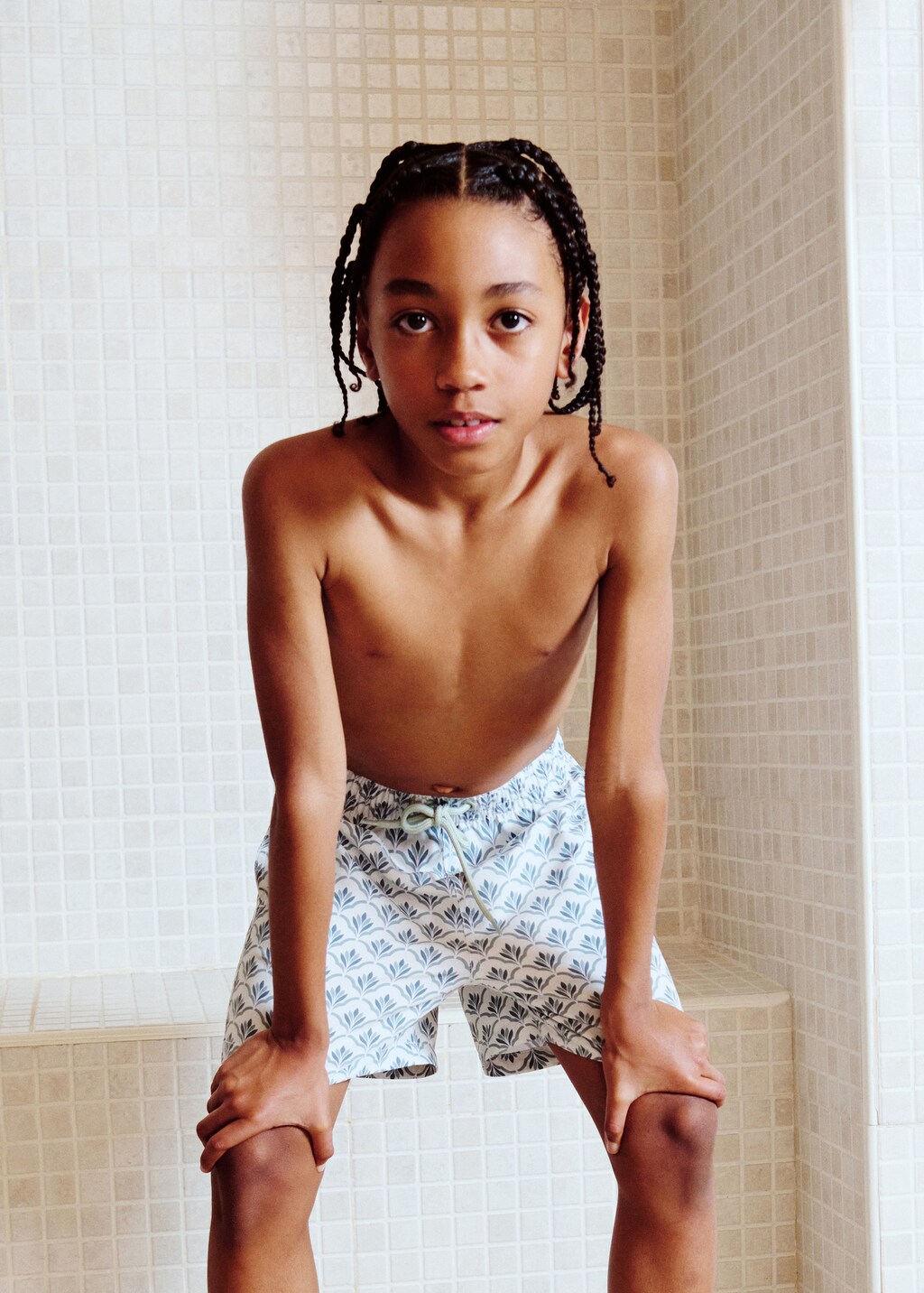 Stretch fabric. Straight design. Short design. Floral print. Elastic waist with adjustable drawstring. Contrast lace-up. Swimwear collection.