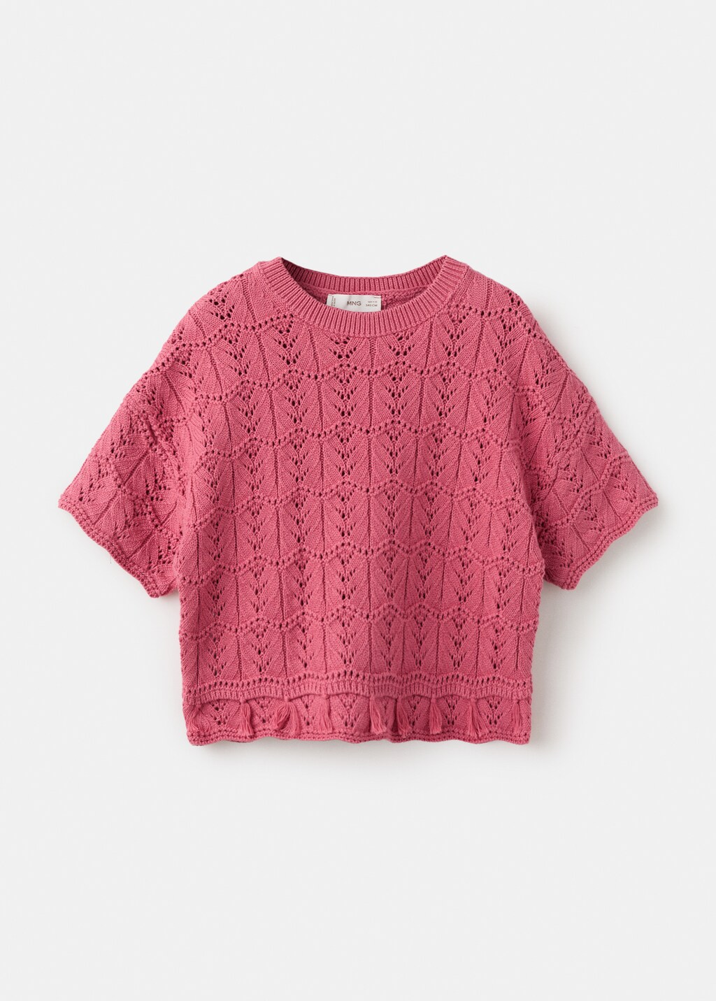 100% cotton fabric. Open-knit fabric. Round neck. Short sleeves. Ribbed collar and cuffs. Fringe detail on the hem. Total look.
