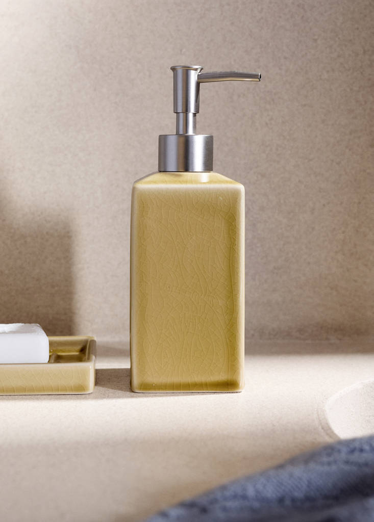 100% ceramic. Height: 12cm. Soap dispenser. Designed with crackle glaze ceramic, a technique that allows for a cracked finish, creating an aged and elegant effect. Available in three colours. Complete with more products from the collection