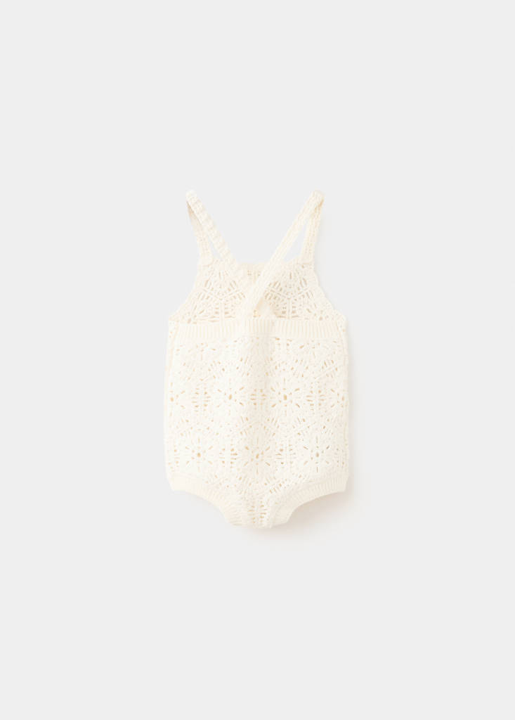 Cotton fabric. Crochet design. Straight collar. Straps. Bottom opening with button fastening
