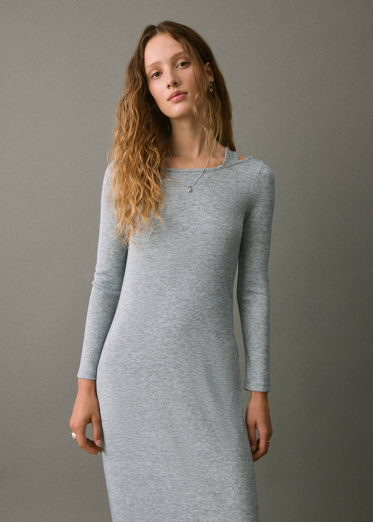 Long dress with cut-outCurrent price [€ 29.99 ]€ 29.99Select a colourMedium Heather GreySelect your sizeXXSNot available. I want it!XSNot available. I want it!SNot available. I want it!MNot available. I want it!LNot available. I want it!DimensionsNotify meAdd to WishlistSee lookFree delivery to storeKnitted fabric. Fluid fabric. Long design. Straight design. Round neck. Cut-out detail. Long sleevesDetails, composition and careStore availability