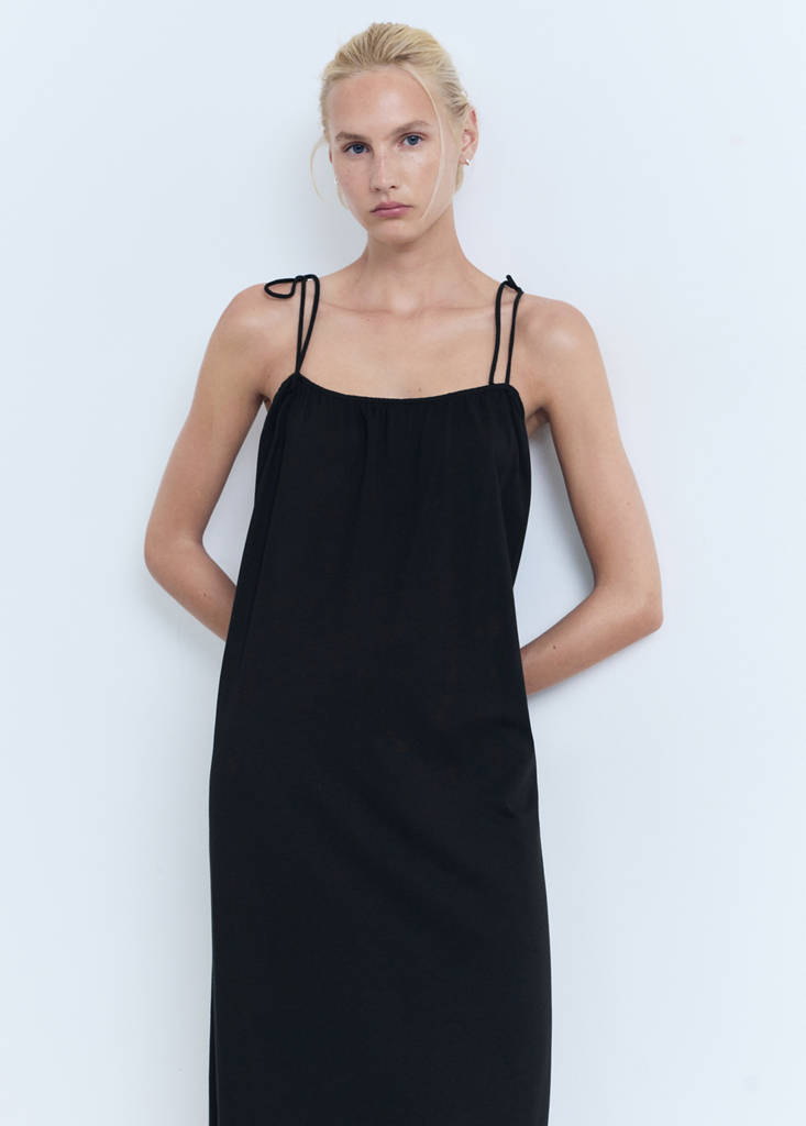 100% Cotton. Long design. Straight design. Low neckline. Gathered neckline. Sleeveless. Thin-straps with bow closure. This garment is part of our casual collection, designed to stylishly accompany you in your day-to-day life