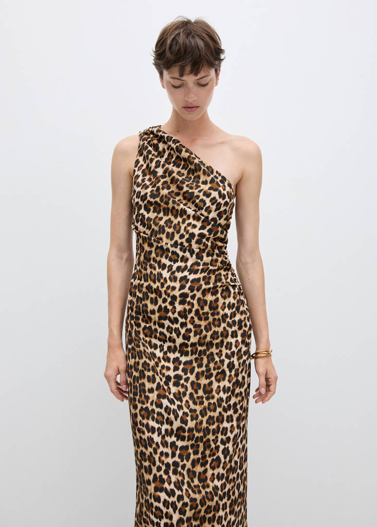 Fluid fabric. Long design. Animal print. Asymmetric neckline. Wide strap. Invisible lateral zip fastening. Fitted design