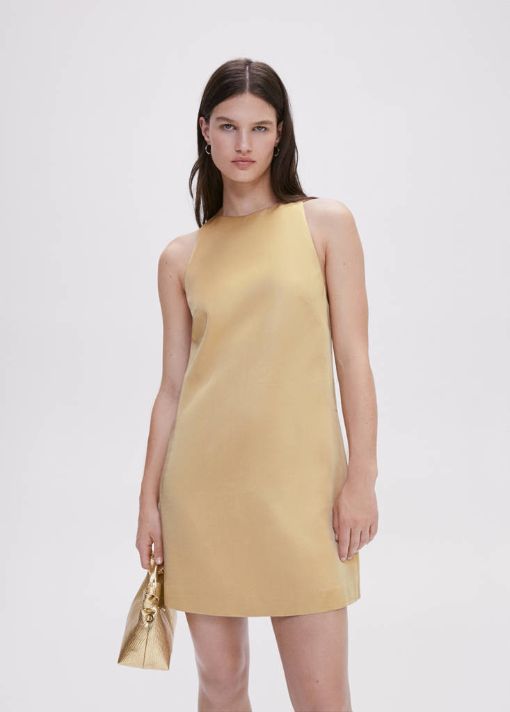 Selection Collection. Flowy fabric. Linen mix. Satin. Short design. Straight design. Halter neck. Sleeveless. Dart detail. Inner lining. Party and events collection