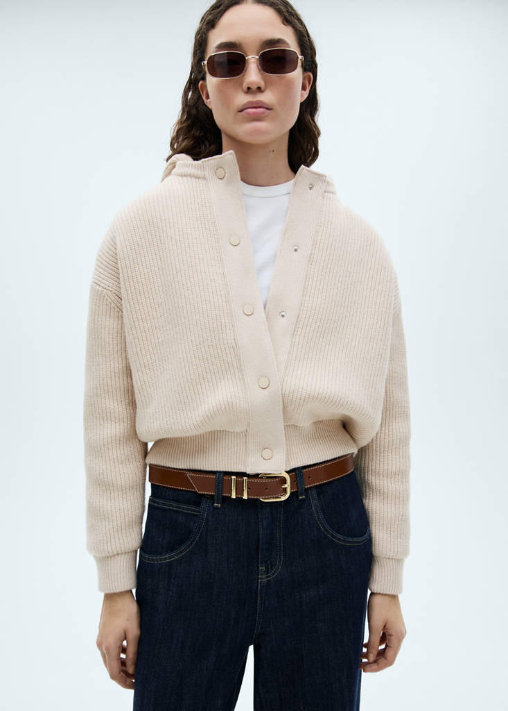 Quilted design. Long sleeves. Inner lining. Straight design. Chunky knit fabric. Hood. Front snap button closure