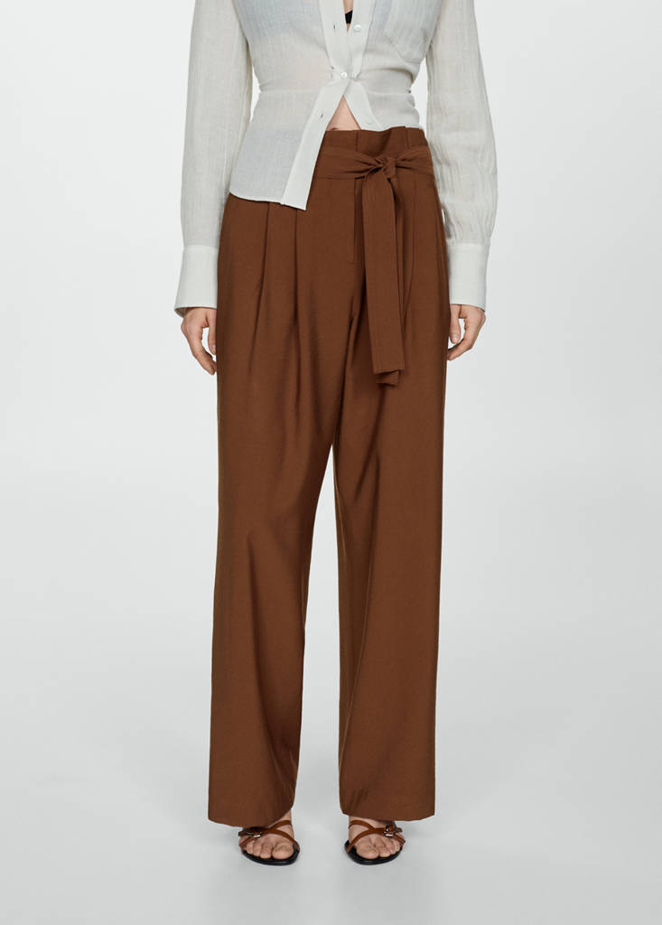 Fluid fabric. Mid-rise. Long design. Straight design. Two side patch pockets. Two pockets with flaps on the back. Concealed button, hook and zip fastening. Ribbon on the waist with tie closure