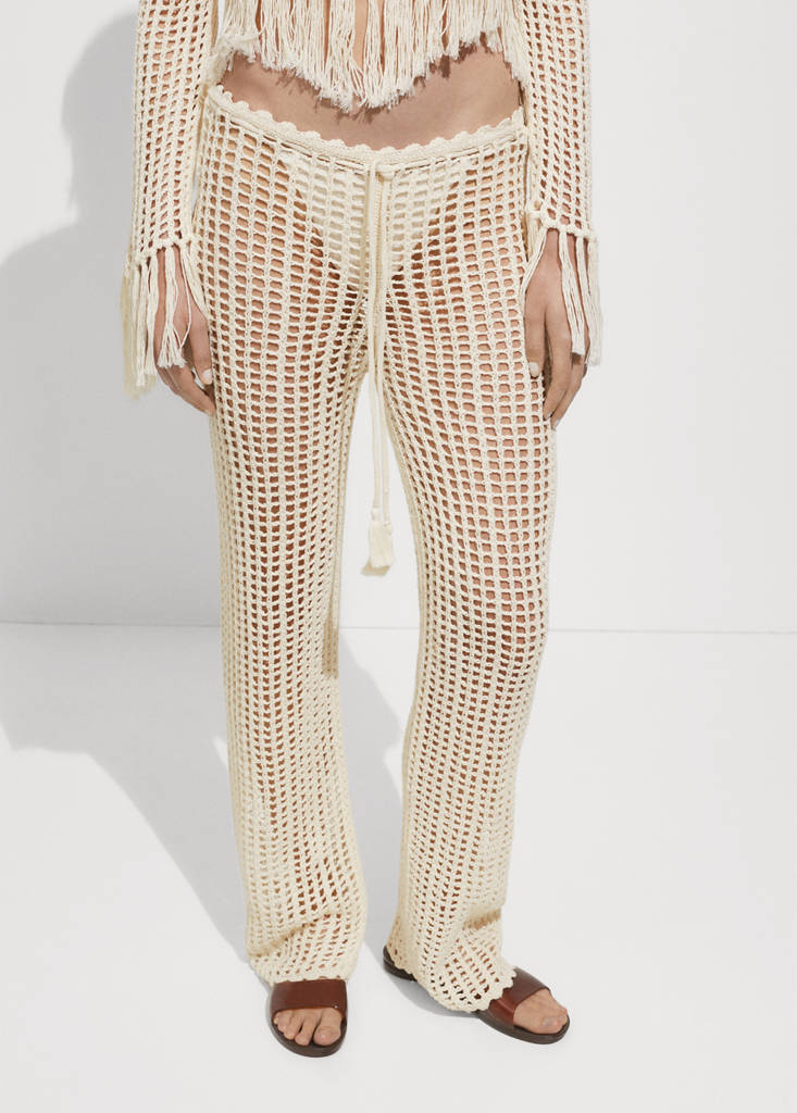 Cotton blend fabric. Midpoint. Mid-rise. Long design. Straight design. Openwork design. Elastic waist with tie closure. Total look