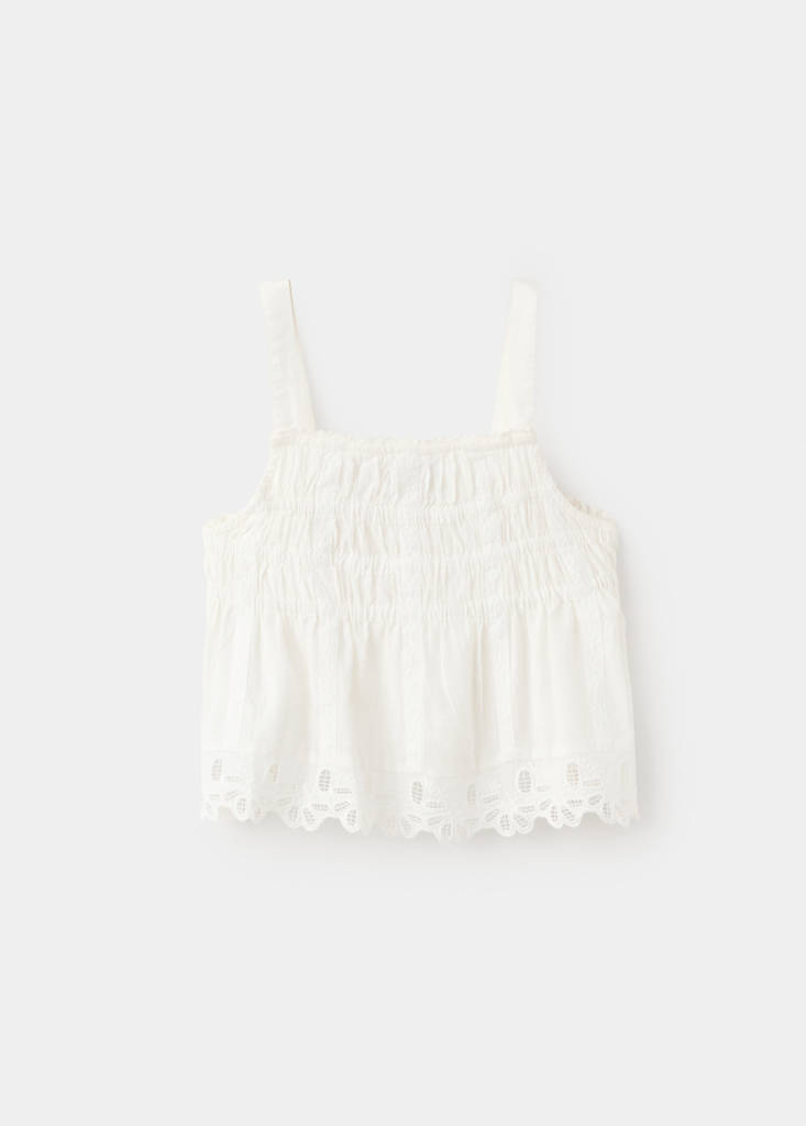 100% bavlna. Tkanina s texturou. Rovný střih. Rovný límec. Ramínka. Vyšívané detaily s průstřihy