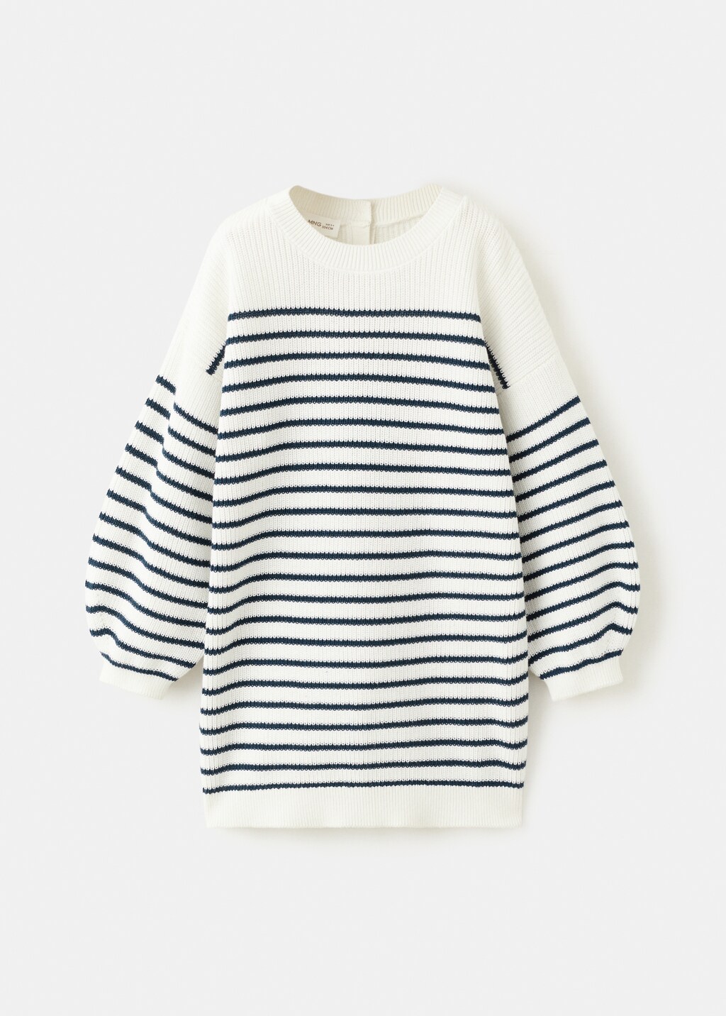 Tkanina 100% bavlna. Pletenina. Pruhovaná tkanina. Midi design. Rovný střih. Kulatý výstřih. Dlouhé rukávy. Žebrovaný límec, manžety a lem. Zapínání na knoflíky vzadu.