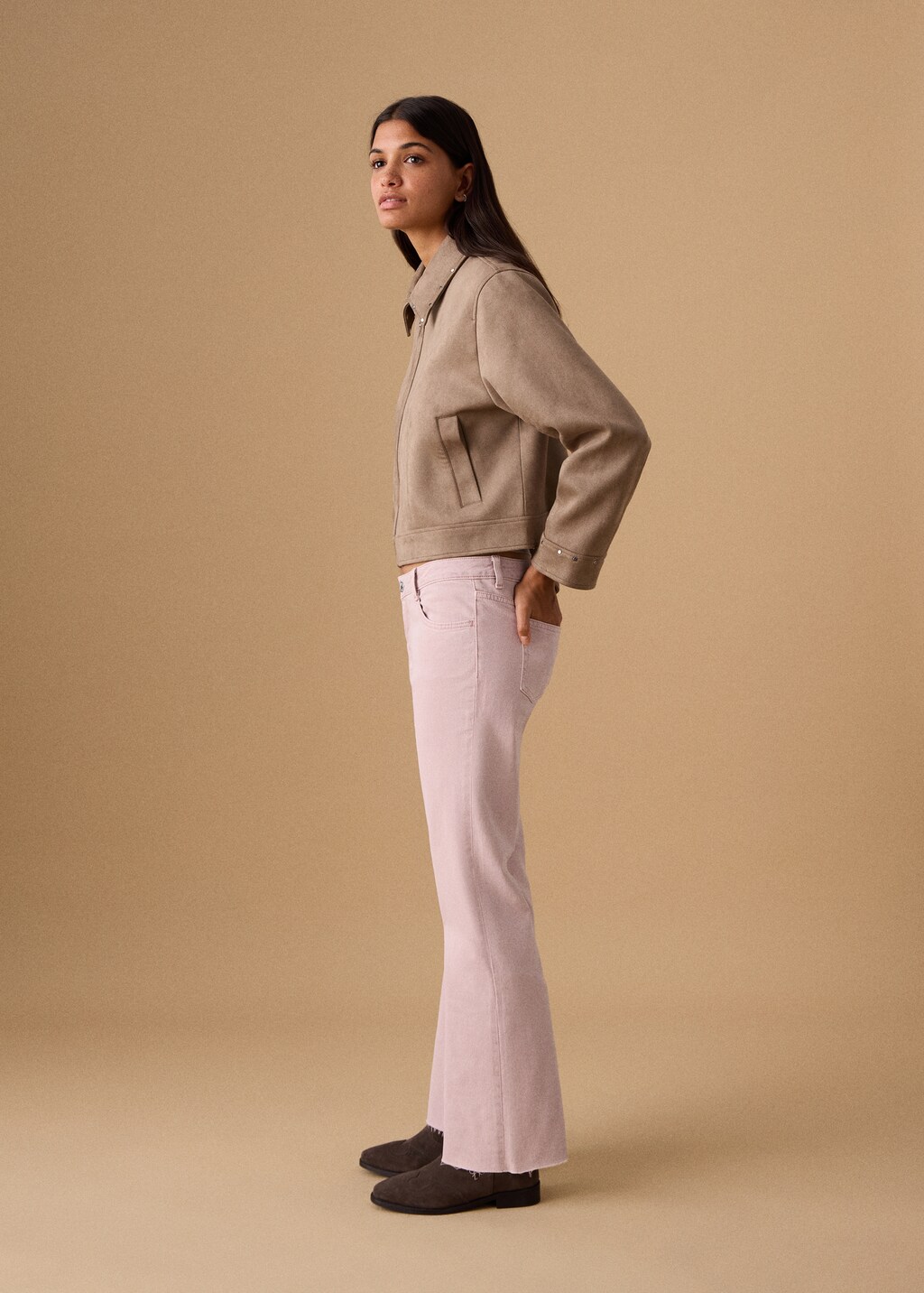 Dlouhý Dlouhý. Regular Waist pas. Střední plochá struktura. Bavlněná tkanina. Elastická tkanina. Crop design. Stylu flare do zvonu. Střední pas. Poutka na pásek. Zapínání na knoflík a zip. Dvě boční kapsy. Dvě nášivkové kapsy vzadu. Roztřepený spodní lem kalhot.