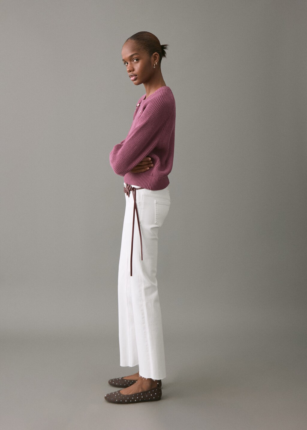Dlouhý Dlouhý. Regular Waist pas. Střední plochá struktura. Bavlněná tkanina. Elastická tkanina. Crop design. Stylu flare do zvonu. Střední pas. Poutka na pásek. Zapínání na knoflík a zip. Dvě boční kapsy. Dvě nášivkové kapsy vzadu. Roztřepený spodní lem kalhot.