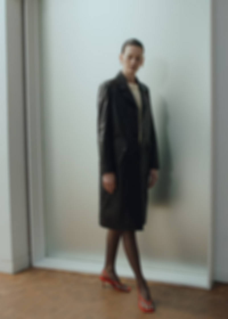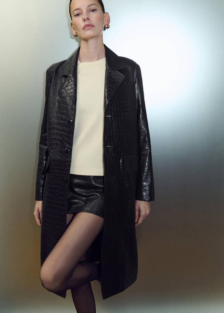 100% ovčí kůže. Krokodýlí efekt. Rovný design. Límec do V s klopou. Klopy s výřezem. Dlouhé rukávy. Dvě kapsy s patkou. Přední zapínání na knoflíky. Total look. Tento kabát zkombinujte s krátkou sukní ve stejném stylu pro vytvoření 'total look' z kůže. Exkluzivně online. Kolekce Selection