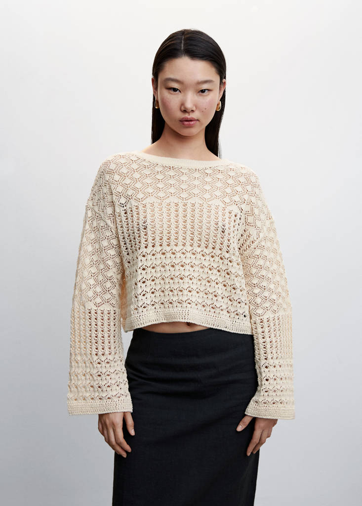 Úplet s volným vzorem. Dírkovaná látka. Rovný střih. Kulatý výstřih. Dlouhý rukáv. Bez zapínání. Festivalová sezóna