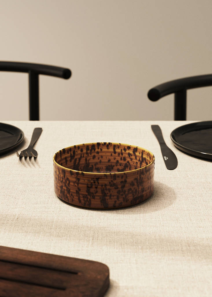 100% stoneware. Diameter: 12.5 cm. Height 5cm. Reactive-effect enamel. Printed design. Polka-dot print. Adds a touch of simplicity and elegance to your table. Coordinates with more products from the collection