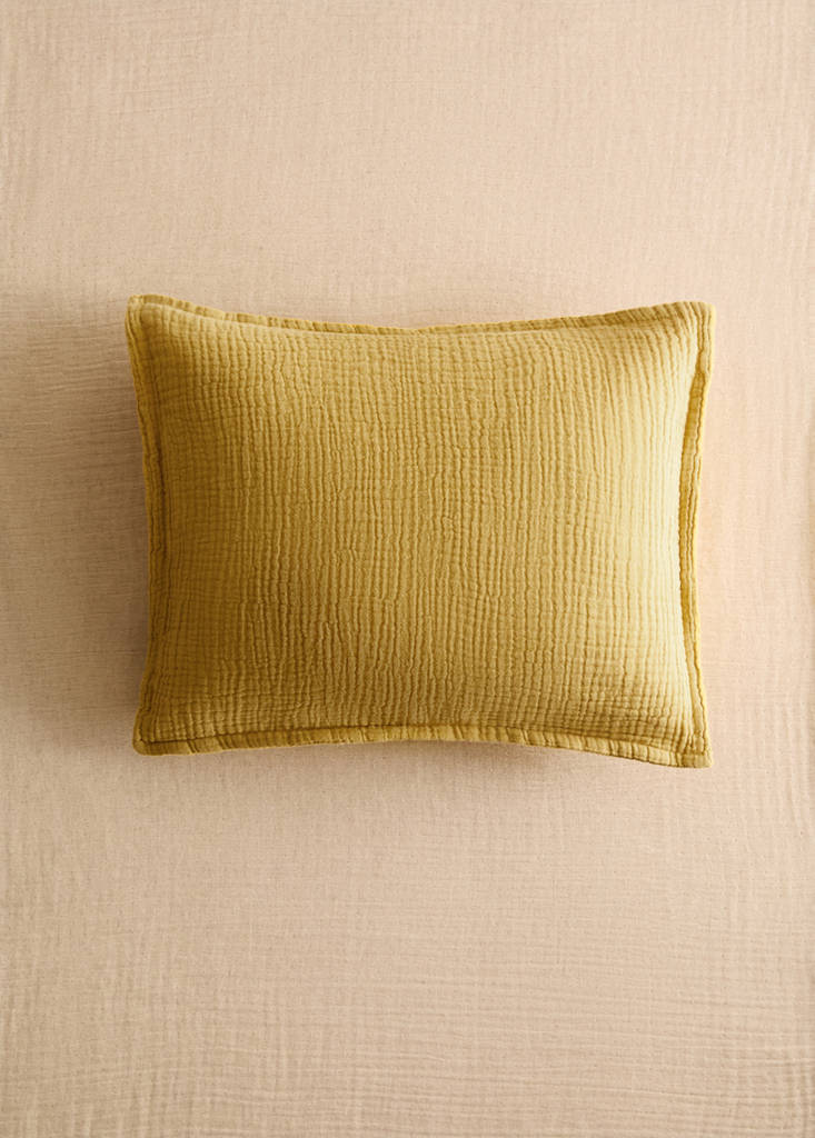 Gauze children's cushion cover 30x40 cmCurrent price [599 Kč ]599 KčSelect a colourYellowSelect your size30x40cmAddAdd to your wishlistSee lookFree delivery to store100% Cotton. Gauze fabric. Size: 30x40cm. Linen-cotton garment-dyed cot bedspread. Available in different colours. With closure. No FillingDetails, composition and careStore availability