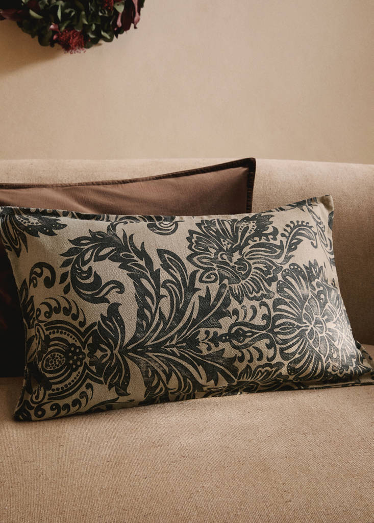100% Linen. Size: 40x60cm. The Damask print cushion cover is the ideal design, combining sophistication and high-quality materials. Perfect for those who appreciate unique and traditional details in home décor. The cover has been crafted in Spain, which means its local production enhances its exclusivity and high-quality craftsmanship.. Christmas Collection