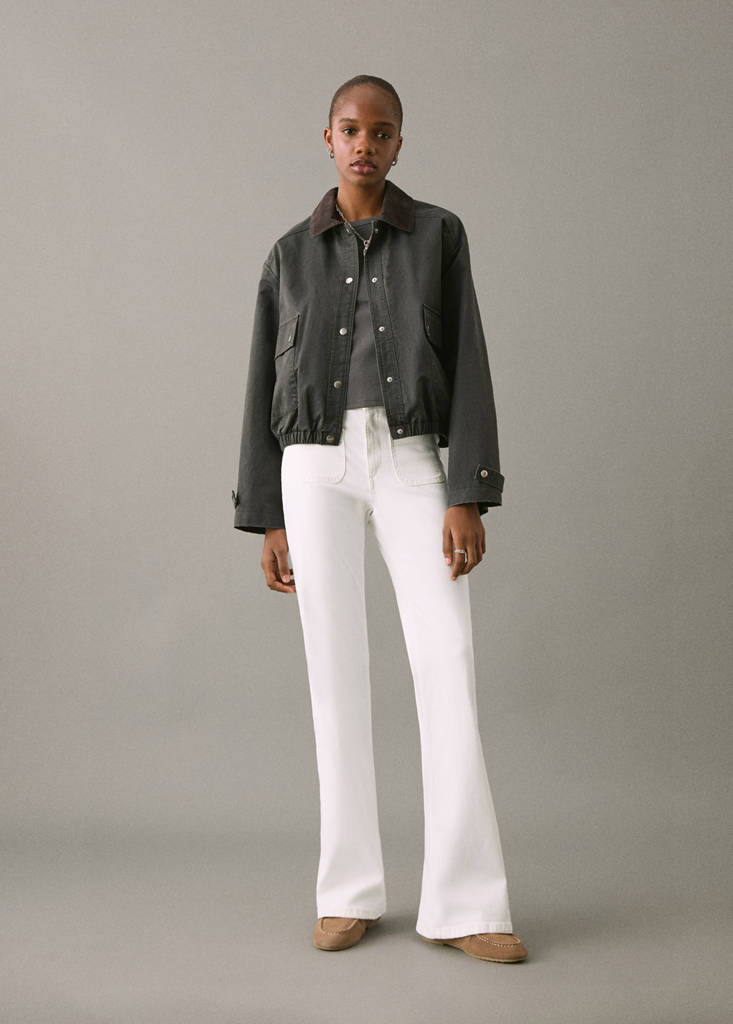 Cotton fabric. Stretch fabric. Long design. Flare design. Belt loops. Button and zip fastening. Two front patch pockets. Denim-style cotton fabric. Flared design. Mid-rise. Patch pockets on the back. Loops on the waist. Double button and zip closure