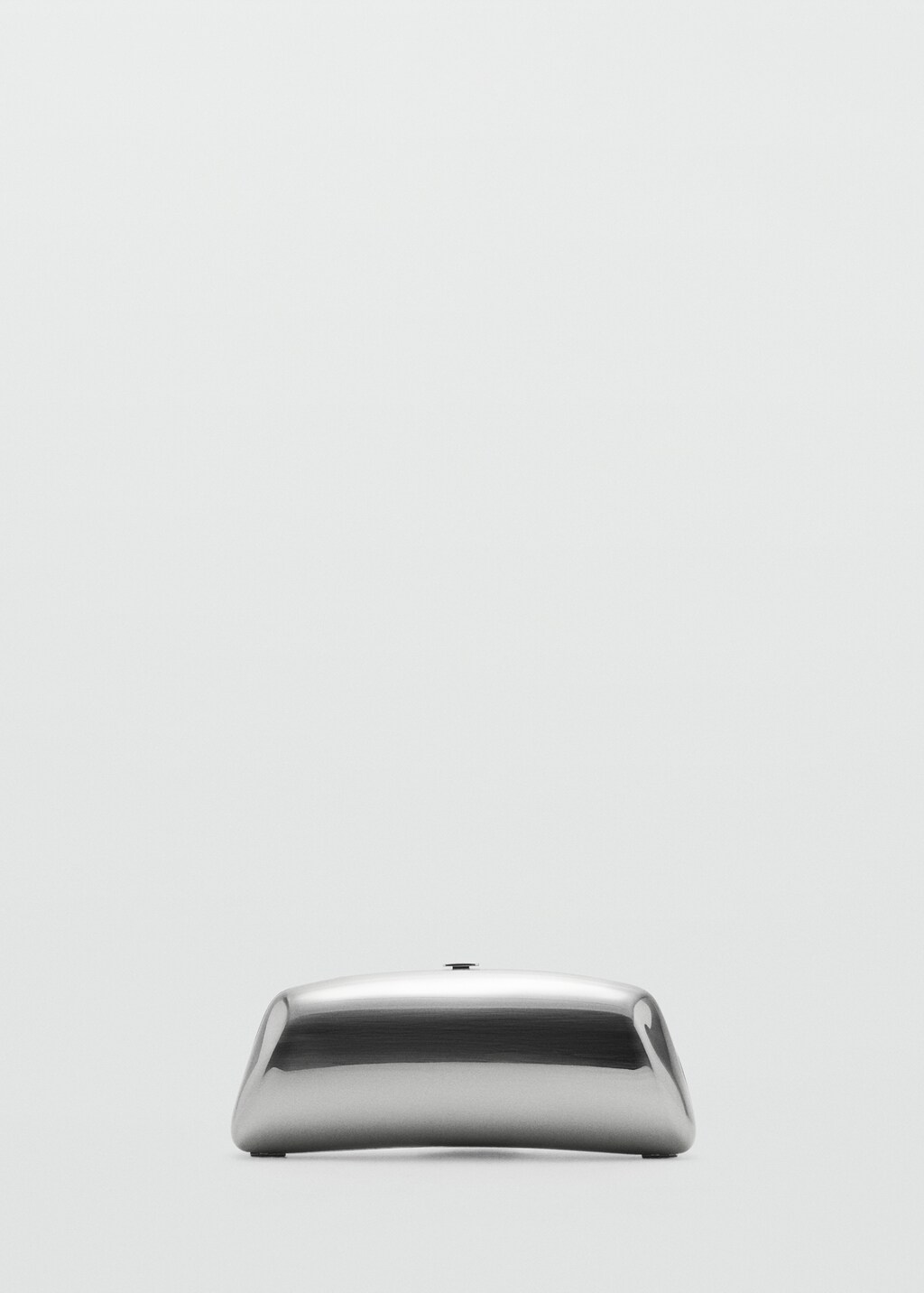 Metallic design. Rectangular design. Clutch style. Removable chain handle. Metal snap closure. 100% cotton lining.