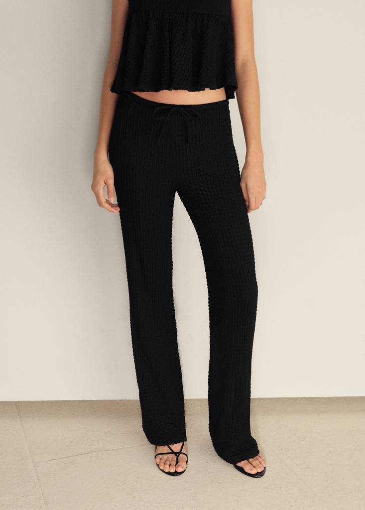 Stoff mit Struktur. Langes Design. Gerades Design. Mittlere Bundhöhe. Elastischer Bund. Verstellbare Schleife am Bund. Ohne Verschluss. Total Look
