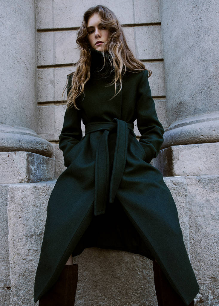 Manteco-Gewebe aus italienischer Wolle. Mischgewebe aus Schurwolle. Langes Design. Gerades Design. Trichterkragen. Lange Ärmel. Gürtelschlaufen. Gürtel im Kimono-Stil. Vorderer Knopfverschluss. Innenfutter. In Plus-Size erhältlich
