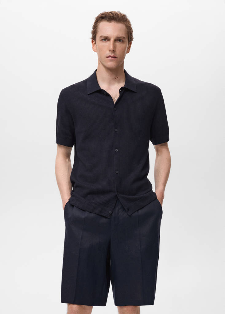 Regular Fit. Gewebe aus Baumwolle, Leinen und Viskose. Kurze Ärmel. Kragen, Ärmel und Saum in Rippstrick. Gerader Saum
