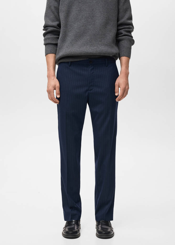 Slim Fit. Mittlere Bundhöhe. Streifendesign. Vorderer Verschluss mit doppelter Knopfleiste und Reißverschluss. Zwei Vordertaschen. Zwei Leistentaschen hinten. Bügelfalte vorne und hinten