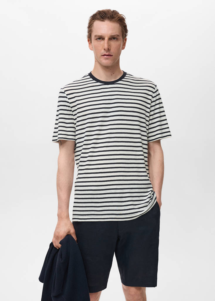 Slim Fit. Leinen-Mix. Streifendesign. Rundhalskragen mit Kontrastsaum. Tailliertes Design. Kurze Ärmel. SMART ETHEREAL Thema. Gerader Saum