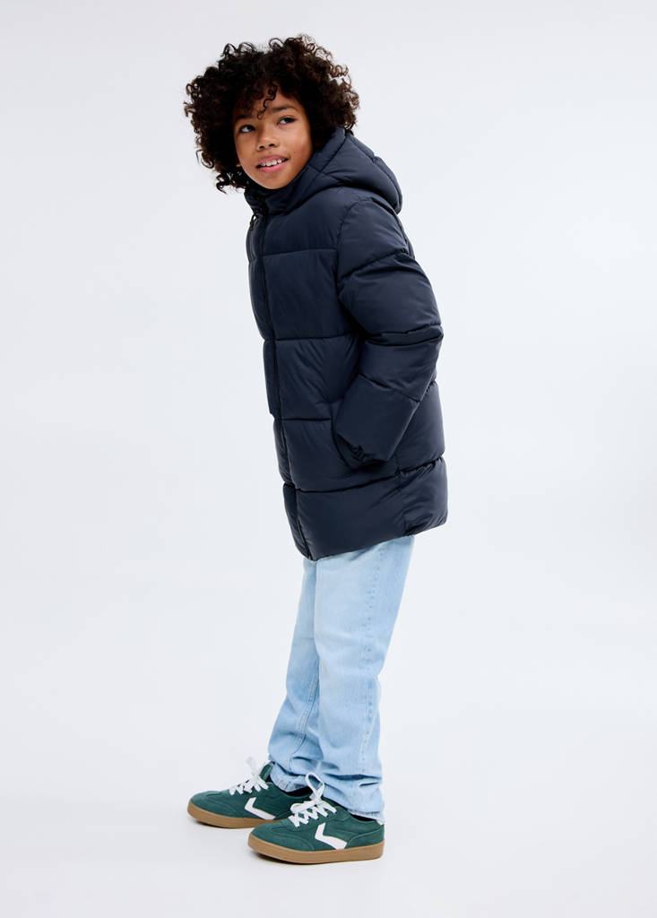 Steppstoff. Wasserdichter Stoff. Gerades Design. Langes Design. Mit Kapuze. Lange Ärmel mit elastischen Bündchen. Reißverschluss. Zwei seitliche Taschen. Fleece-Futter