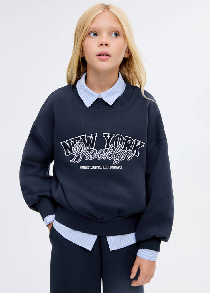 Baumwollstoff. Gerades Design. Gesticktes Design. Stickerei vorne. Rundhalsausschnitt. Lange Ärmel. Gerippter Kragen, Bündchen und Saum. Back to School