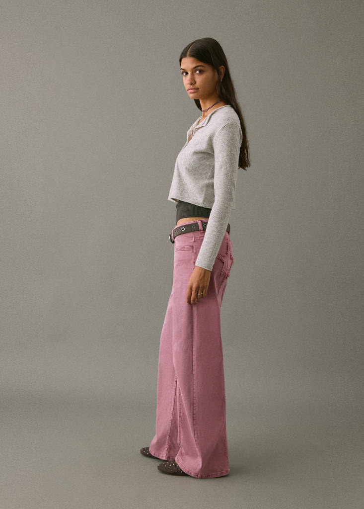 Baumwollstoff. Jeans-Stil. Langes Design. Straight Fit Design. Regular Waist. Gürtelschlaufen. Zwei seitliche Paspeltaschen. Aufgestickte Sterne auf der Rückseite